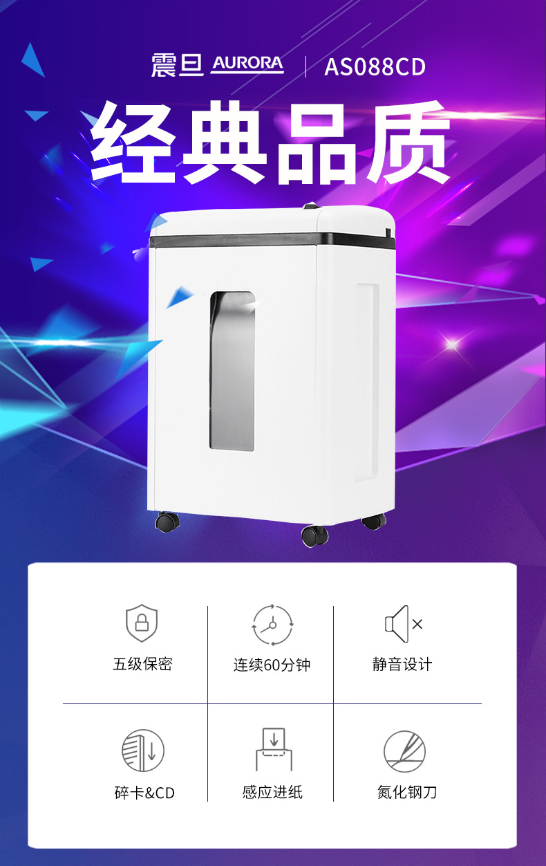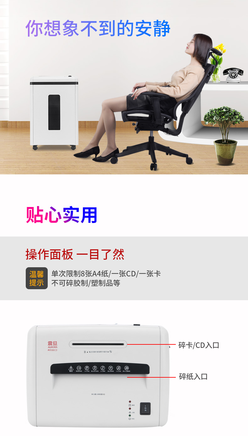 • 產(chǎn)品名稱:震旦(AURORA) AS088CD多功能碎紙機辦公單次8張碎CD 5級保密低音