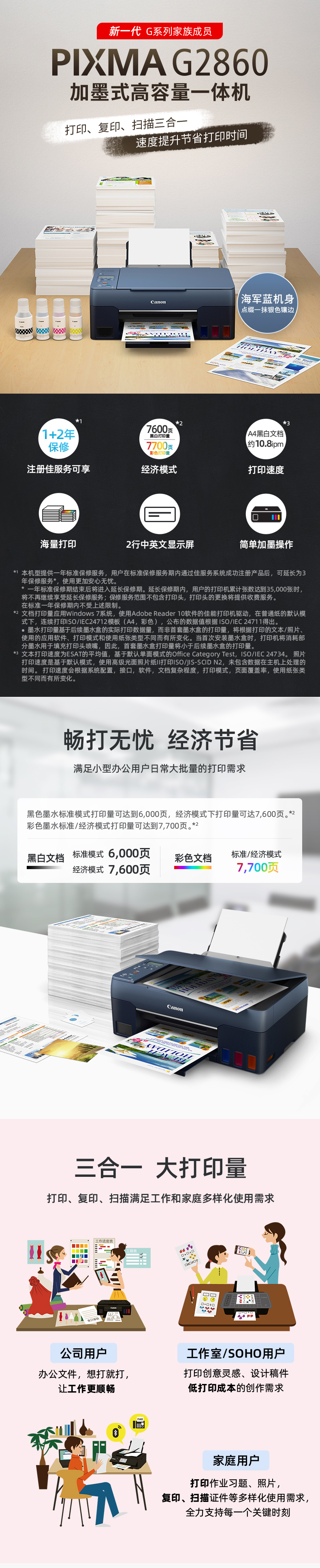 • 佳能 G2860大容量可加墨彩色多功能一體機(打印/復(fù)印/掃描)
