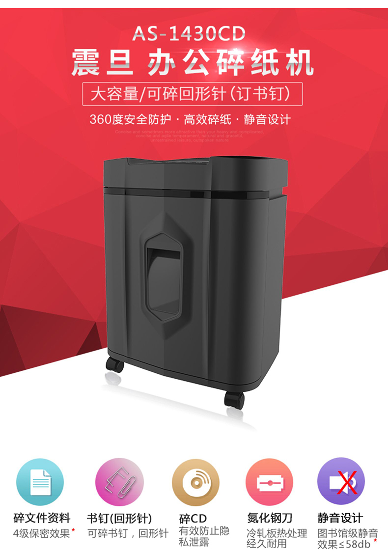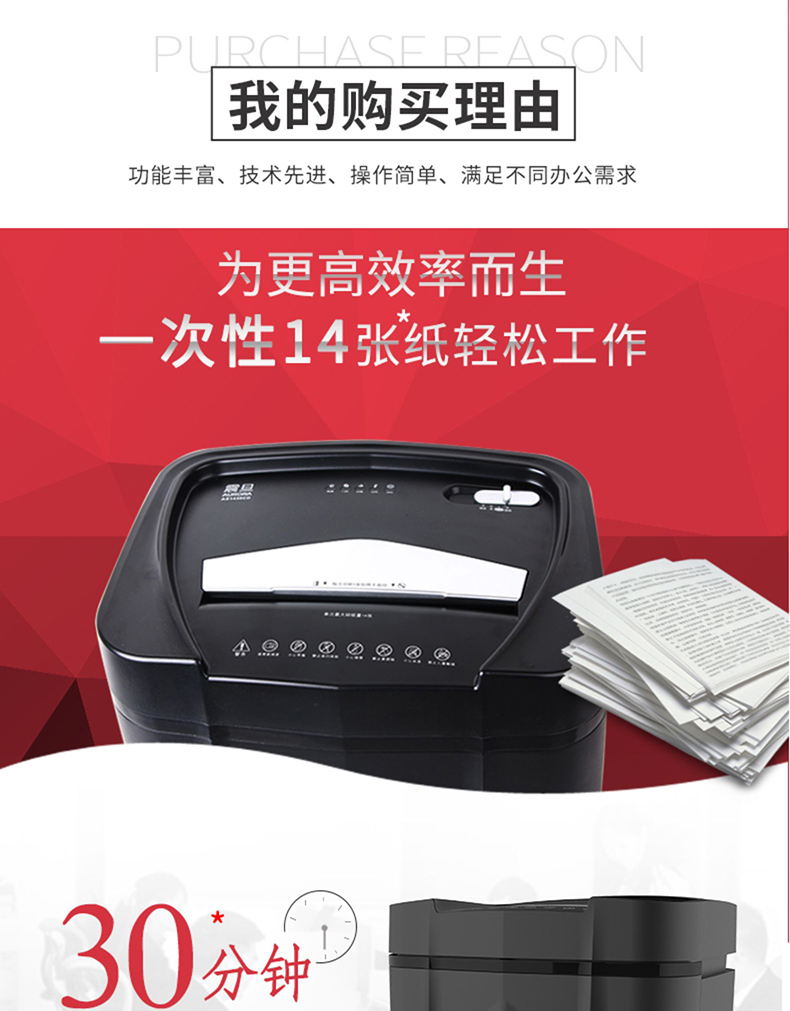 • 產(chǎn)品名稱:震旦 AS1430CD 20L大容量30分鐘長時(shí)間4級(jí)保密辦公碎紙機(jī)