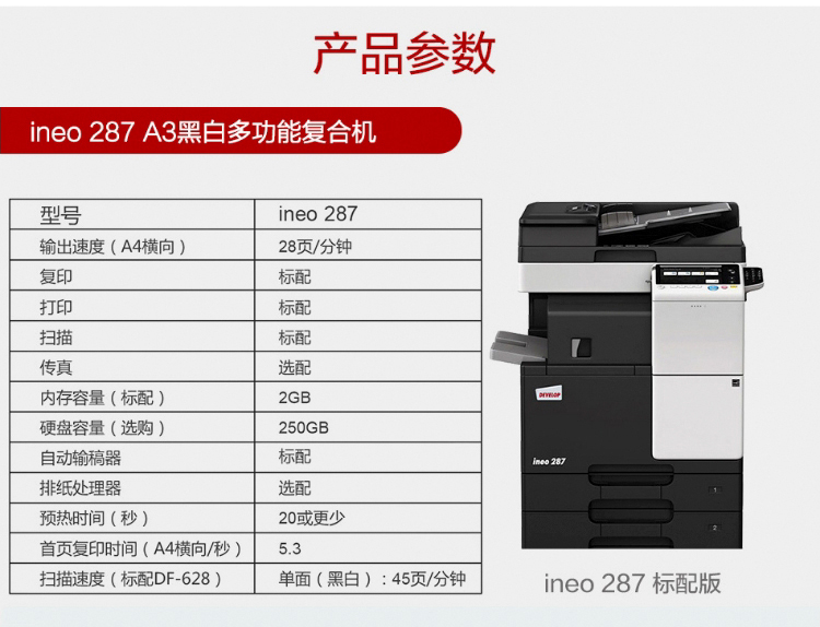 • 產(chǎn)品名稱:德凡 DEVELOP ineo287 A3黑白多功能復(fù)合機(jī)標(biāo)配
